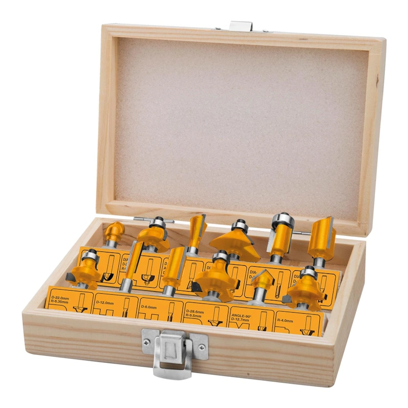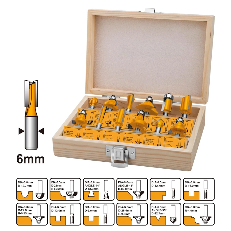 • Σετ 12 μαχαίρια ρούτερ για διάφορες εργασίες σε ξύλο όπως δημιουργία αυλακώσεων και εγκοπών, μορφοποίηση, λοξοτομή ή δημιουργία προφίλ και διακοσμητικών κοπών.
